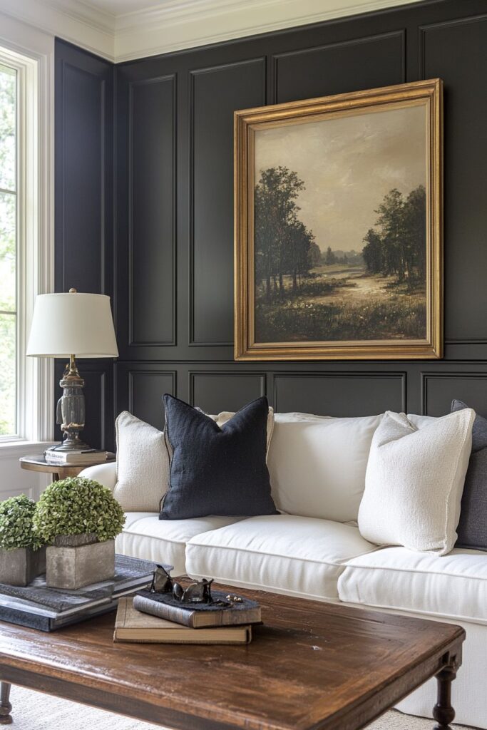 In this space, a beautiful balance is achieved between light and dark, rustic and modern, creating a welcoming atmosphere that is anything but ordinary. The sophisticated dark-paneled wall provides a dramatic backdrop, reminiscent of the deep, shadowed forests of the Appalachian Mountains. This bold choice highlights the bright white sofa, which adds a clean, contemporary feel and invites you to relax.