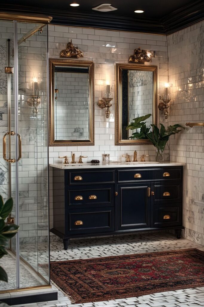 Bold Contrast: The deep navy or black vanity makes a strong, elegant statement against the classic white tile and marble countertops.