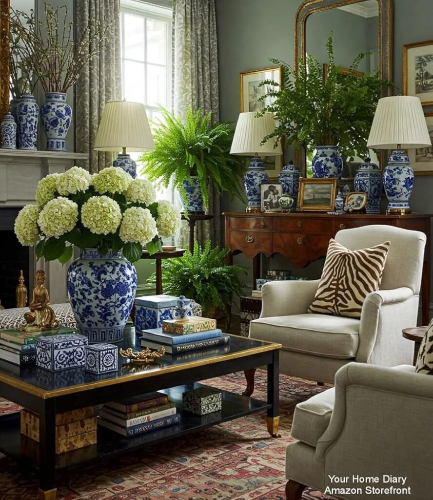 This classic aesthetic can be beautifully complemented with traditional blue-and-white pottery. In a room with deep, moody tones, blue-and-white porcelain offers a serene and sophisticated contrast, as shown in this stunning living room. These ceramic vases and jars, often featuring intricate chinoiserie patterns, are a perfect way to add a touch of color and history to your space, whether used for floral arrangements or as standalone accents. The combination of warm textures like wood and leather with the cool, glossy finish of porcelain creates a rich, layered look.