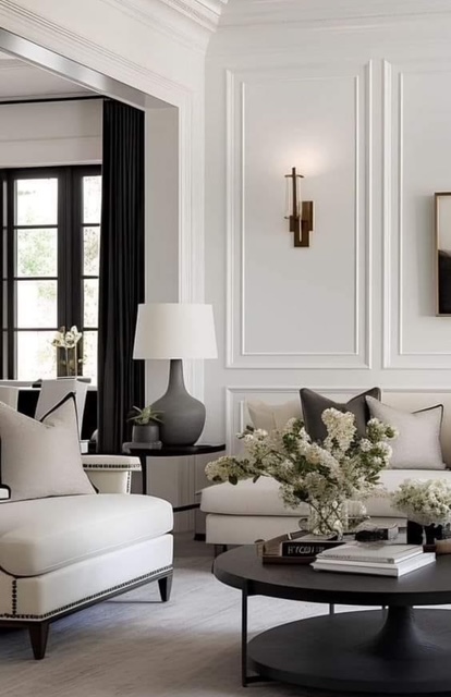 A masterclass in creating a living room that is both elegant and inviting, using a sophisticated, high-contrast palette of black and white. The design is a beautiful blend of traditional architectural details and modern, clean-lined furnishings, resulting in a space that feels both timeless and fresh.