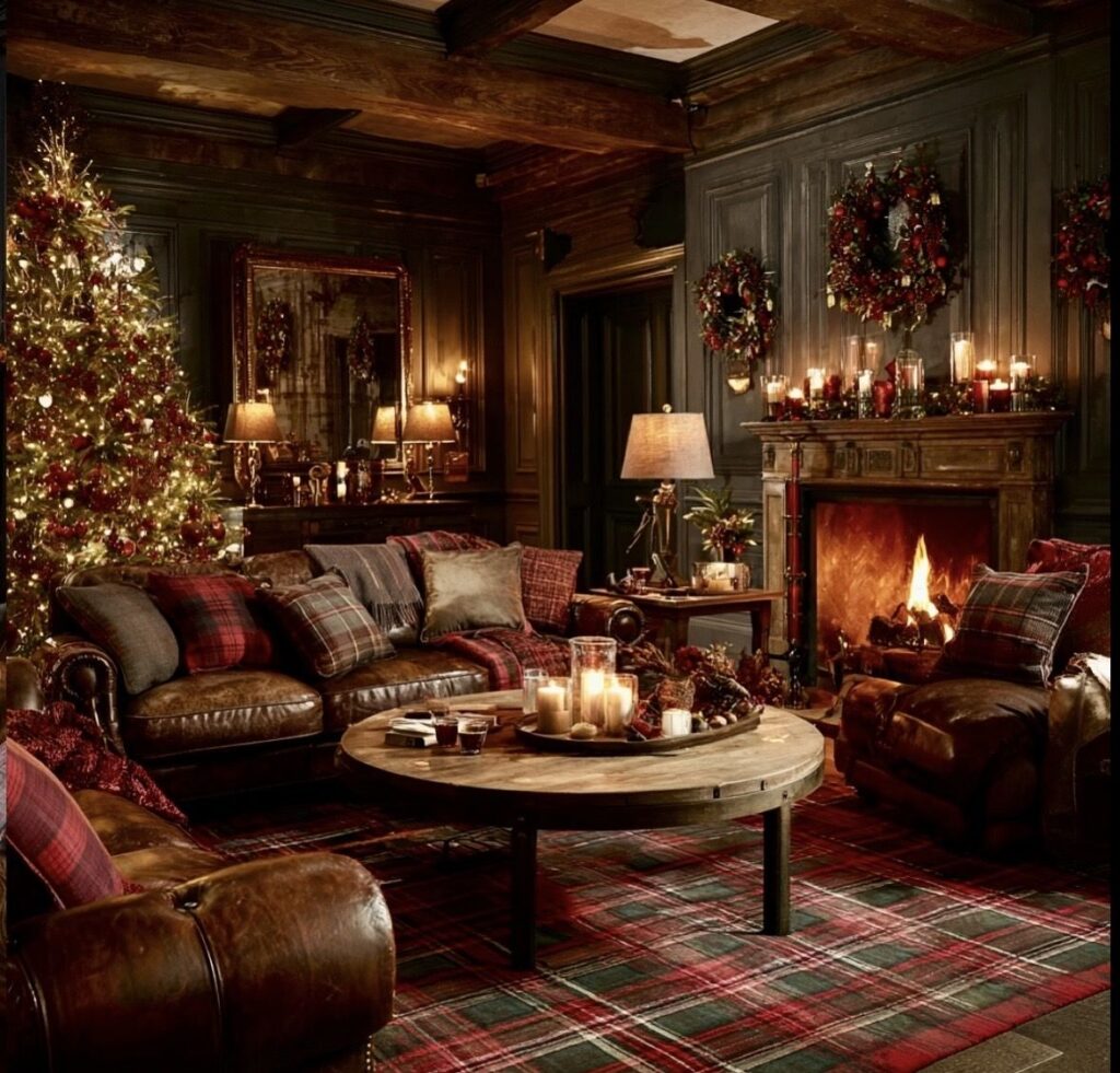 The scene above captures more than just beautiful holiday decor; it embodies the spirit of the North Carolina High Country. The combination of dark woods, rustic stone, and warm, inviting textiles evokes a sense of timeless elegance and cozy comfort, a style often associated with mountain living and the popular “Ralph Lauren Christmas” aesthetic.