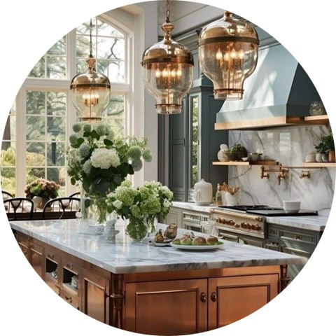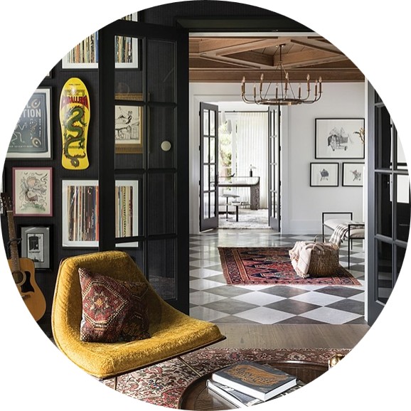 The beautiful image captures a living room that seamlessly blends bold modern design with traditional architectural details. Rich green velvet pillows, a sleek black coffee table, and classic framed artwork…