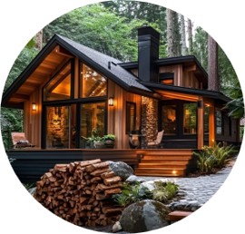 A stunning exterior view of a modern mountain cabin at dusk, featuring warm interior lighting visible through floor-to-ceiling glass windows, natural wood siding, a bold black metal roof and chimney,…