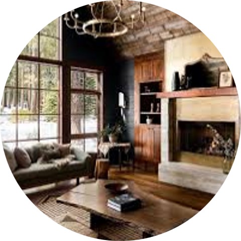 The image above captures the cozy sophistication of mountain living, featuring a spacious living room centered around a grand stone fireplace and large windows that frame a tranquil, snow-dusted forest…
