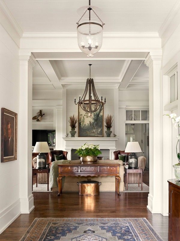 A captivating interior photograph showcases a bright, elegant hallway opening into a cozy living area with rich hardwood floors, traditional furniture, and charming light fixtures, including a rustic wood chandelier and classic bell jar pendant lights. This warm, sophisticated aesthetic perfectly embodies the serene and welcoming lifestyle found in North Carolina’s High Country.