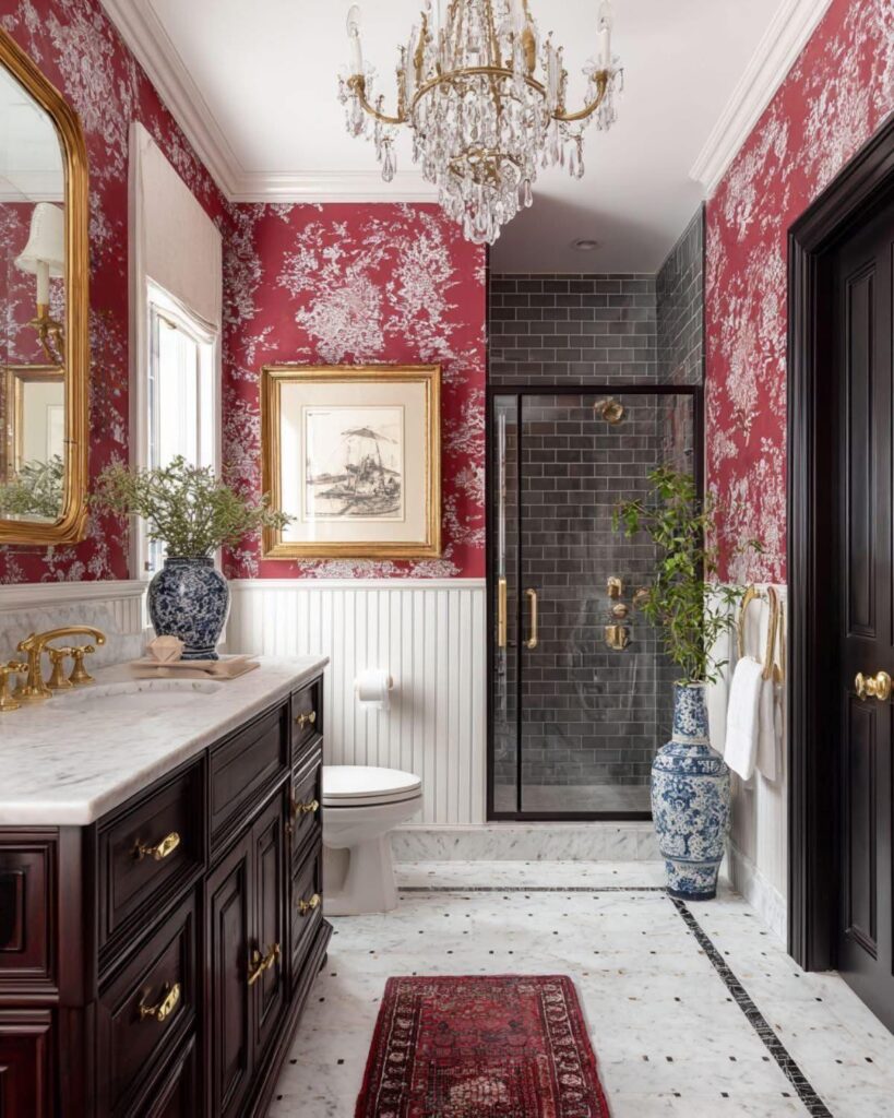 The most striking feature of this bathroom is undoubtedly the rich red toile wallpaper. The intricate white pattern against the deep red background sets a vibrant, traditional tone that instantly draws the eye. This bold choice is balanced beautifully by the crisp white wainscoting and the classic white marble countertop and floor tiles.