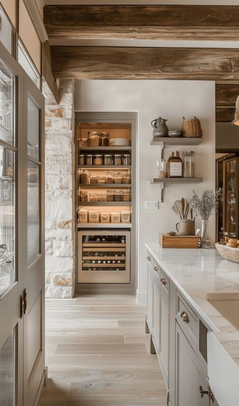 2. **Install Open Shelving:** Add open shelves at various heights to store pantry staples, cans, and boxes.