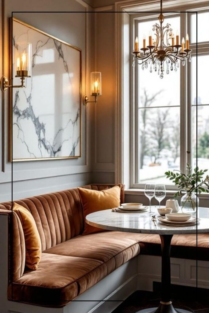 The movement in home design is shifting from formal, expansive spaces to intimate, cozy corners that foster connection and conversation. This image perfectly captures this trend with a luxurious, rust-toned velvet banquette, a round marble-top table, and warm metallic accents, demonstrating how a small space can become a stylish and inviting haven for quiet mornings or casual gatherings.