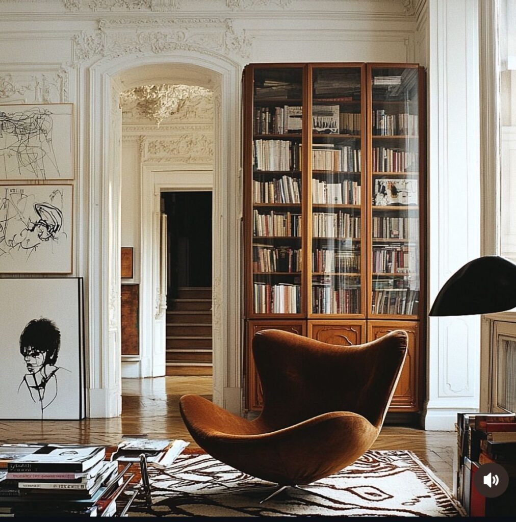 Instead of bold wall colors, the “Medalist Look” uses art and rugs to add the color palette you desire. Here, the warm rust-colored velvet of the iconic Arne Jacobsen Egg Chair and the bold, graphic pattern of the rug introduce warmth and visual interest. Large-scale, minimalist black and white artwork on the walls maintains the clean lines while adding personality. The key is balance: let your statement pieces and artwork drive the color narrative of the room.