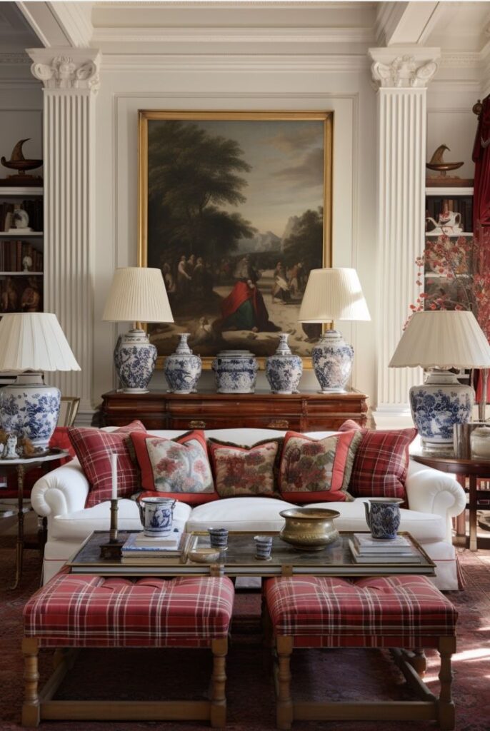 Layering textures and patterns: Layering is key to creating a rich and inviting feel. Combine different textures, such as smooth leather, plush velvet, and cozy wools. Classic patterns like tartan, plaid, and stripes are also staples that add visual interest.Pillow: The Ralph Lauren Tartan Polo Bear Throw Pillow