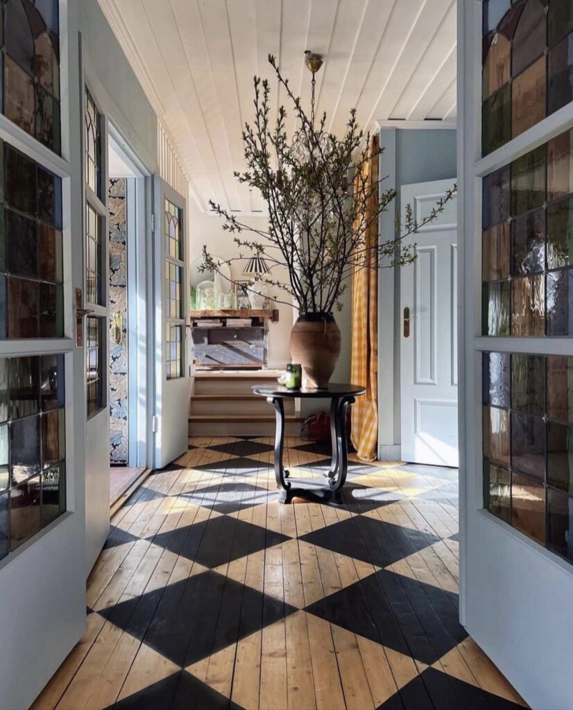 The high level of repetition from smaller diamond tiles can make a space, such as an entryway, feel larger.