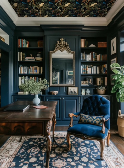 Texture and pattern are layered throughout the space to add visual interest and depth. The ceiling is an unexpected design choice, covered in a detailed floral and botanical wallpaper that brings the eye upward and adds a touch of whimsical flair. A plush, tufted velvet armchair in a slightly lighter shade of blue sits invitingly on a classic patterned area rug, grounding the furniture and tying the color palette together. The armchair is adorned with a decorative pillow featuring a geometric pattern, adding another layer of texture. A large, gilded mirror with a decorative frame hangs above the central cabinetry, reflecting light and making the room feel more expansive.