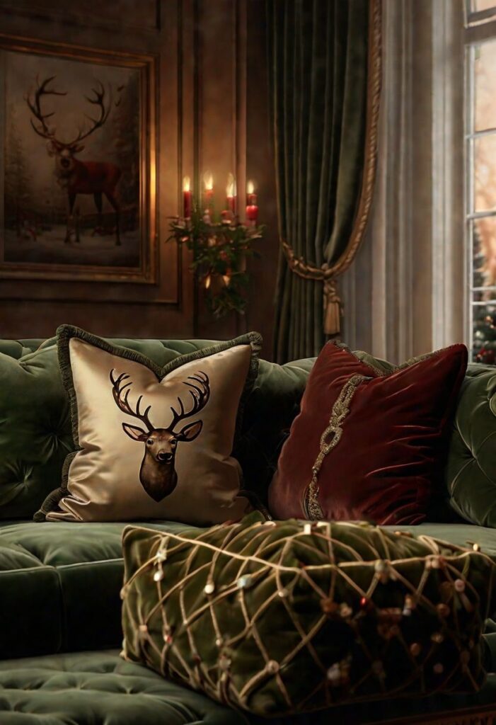 Theme and Texture: The image showcases a rich, traditional aesthetic using deep colors and varied textures (velvet, embroidery, tapestry). A stag or deer motif is featured prominently on a cushion, instantly adding a touch of rustic, natural charm that personalizes the space and evokes a warm, lodge-like feeling.