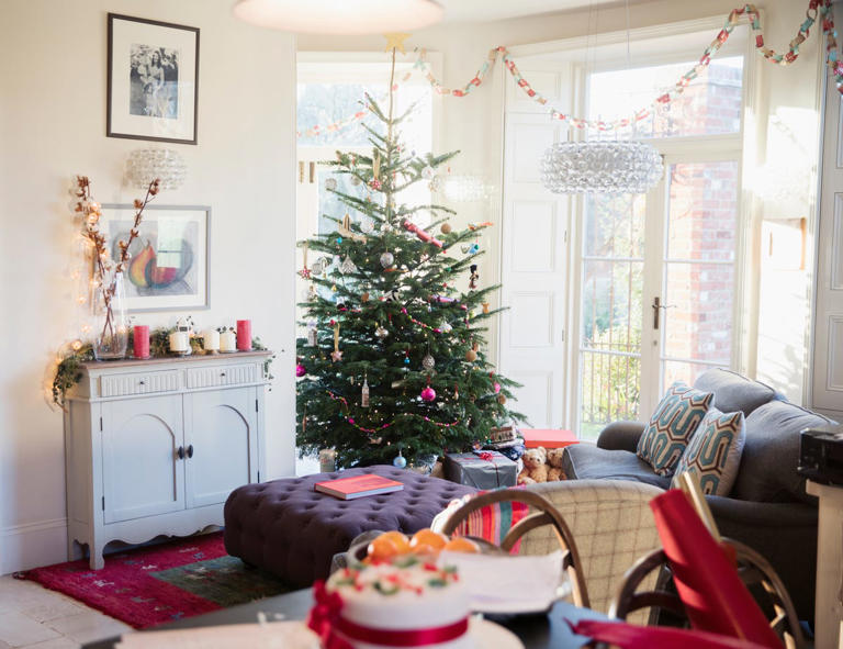 A cozy and bright living room is warmly decorated for Christmas, featuring a large, traditional Fraser fir tree adorned with colorful ornaments and lights. Festive paper chains drape across the ceiling, leading towards large windows that fill the room with natural light. A comfortable-looking couch, a grey side cabinet displaying candles and holiday decor, and a large purple tufted ottoman create an inviting atmosphere, complete with a cake and tangerines on a nearby table, suggesting a joyful holiday gathering.