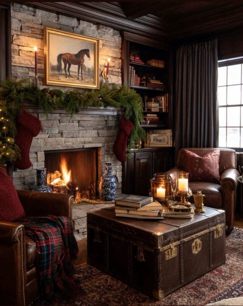 A cozy, warmly lit living room features a stone fireplace with a crackling fire and a lush evergreen garland adorned with red candles and stockings. A vintage horse painting hangs above the mantel, and rich cognac leather armchairs with tartan throws flank the hearth. A large, dark leather trunk serves as a coffee table, covered in books and brass candle holders. This classic, lodge-style decor evokes the warm, traditional aesthetic found in beautiful Ashe County homes during the holiday season.