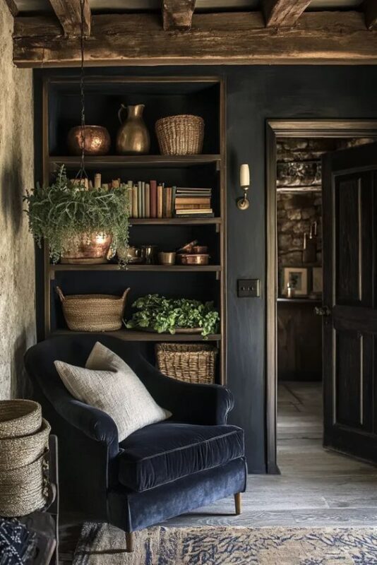 The image above evokes the feeling of a peaceful retreat with its rich wood floors, built-in bookshelves, and abundant plants. This style aligns with the properties found in the scenic High Country of North Carolina.