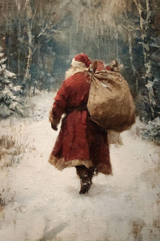 Who doesn’t love the quintessential image of Santa Claus embarking on his magical Christmas Eve journey? The painting in the image captures that timeless, festive spirit, reminding us of the warmth and joy of the holiday season and the dream of a snowy retreat. The artwork, widely available as “Vintage Santa Oil Painting” or “St. Nick” prints, evokes the cozy feeling of a true winter wonderland.