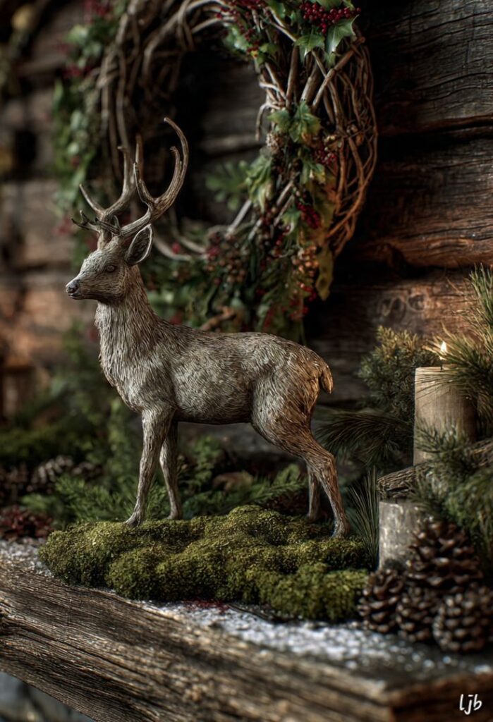 Feature Natural Elements: Pinecones, birch logs, and antlers are perfect for winter decorating. Arrange them in a dough bowl on your coffee table or use them to fill empty spaces on shelves or mantels. The deer figurine in the image is a perfect example of a piece that works for both Christmas and the rest of the winter.