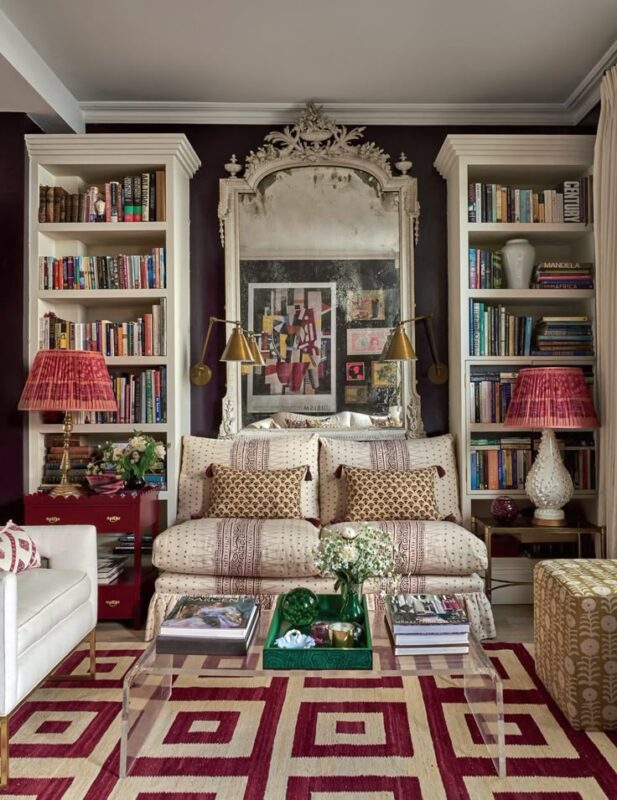Maximalism and eclectic design often go hand-in-hand. This room expertly blends different design styles and eras, creating a unique and curated look. The classic white bookshelves and dark-toned furniture create a traditional base, while the modern clear coffee table and the bold patterns on the rug and lampshades give the space a contemporary edge. The combination of these elements feels intentional and personal, showing that the most beautiful homes are those that reflect the people who live in them