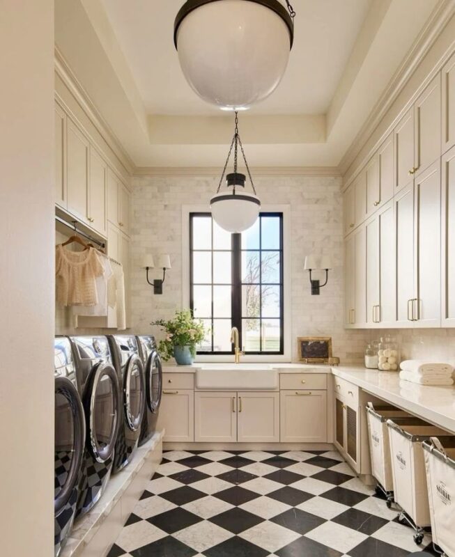 Bold Monochrome: All-black or all-white laundries are big for 2025—think matte black cabinets with a stainless sink or glossy white everything for a clean, modern edge