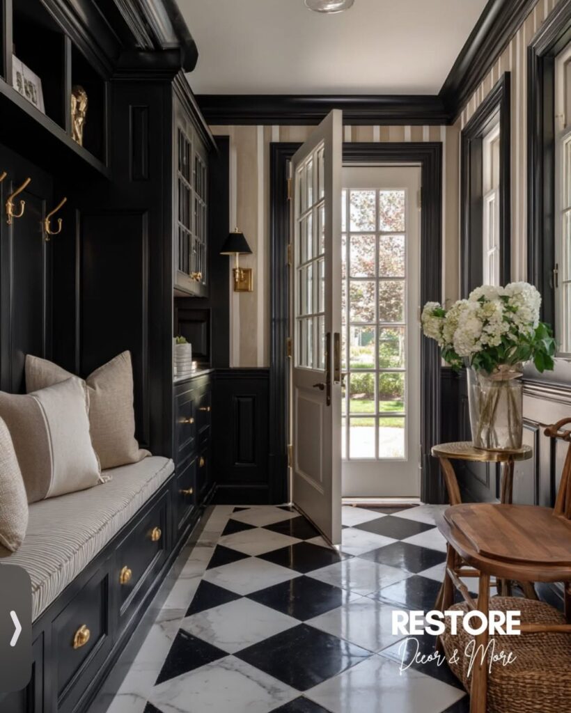 The entryway is the first impression your home makes, a space that should seamlessly blend style and function to set the tone for the rest of your living areas. The stunning space pictured above, with its classic black-and-white marble flooring and custom cabinetry, exemplifies a timeless design that is both durable and elegant, perfect for enduring the natural beauty and active lifestyle of the High Country of North Carolina.