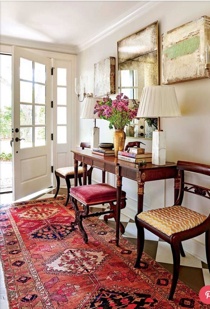 The image displays a welcoming, traditionally decorated entryway featuring a rich, red and blue patterned vintage rug over a black and white checked floor. A classic mahogany console table is adorned with a marble lamp, a floral arrangement, and decorative mirrors on the wall above. Two small, upholstered stools are tucked beneath the table, and a wooden chair sits beside it, creating a warm, sophisticated, and collected aesthetic.