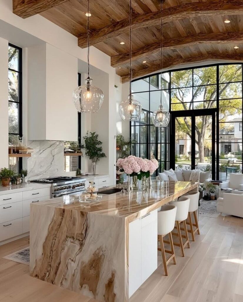 Natural Materials: The use of a striking natural stone waterfall island and rich, exposed wood ceiling beams brings warmth and texture to the space. These materials reflect the area’s appreciation for local heritage and the rugged mountain landscape, moving away from overly sterile designs.