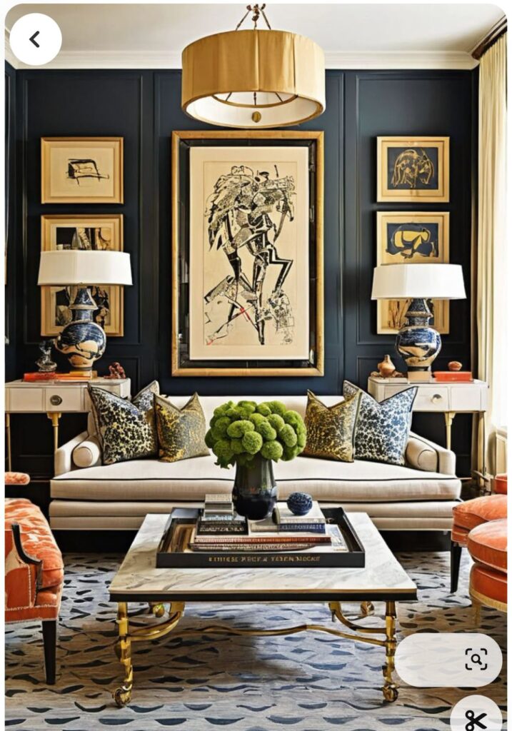The living room in the image expertly employs bold design choices, such as deep navy walls paired with vibrant orange and blue accents, a gold-framed abstract art piece, and a striking zebra-print rug and pillows, all within a traditional architectural setting. This idea of bringing unique, personality-filled elements into a timeless space is what makes a house a true home.
