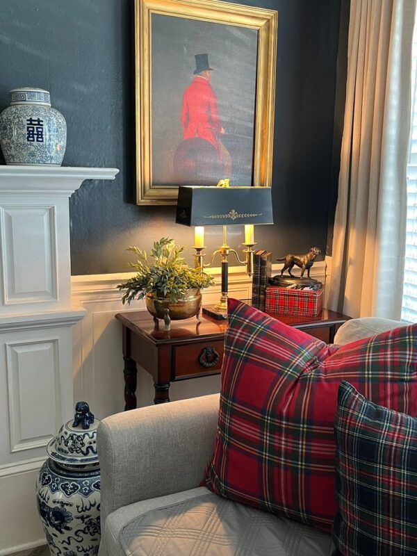 The interior design featured in this image, with its classic equestrian art, rich tartan plaids, and blue and white ceramics, beautifully embodies the traditional elegance and warmth that many seek in their mountain homes. It is a style that feels both timeless and inviting, a perfect match for the serene lifestyle found in Ashe County, North Carolina.