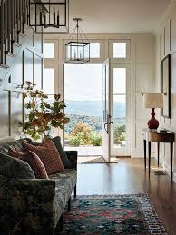 The grand foyer captured in the image makes a powerful statement about luxury living, blending classic design with a breathtaking view of rolling mountains. The tall ceilings, the elegant paneling, the bold iron chandeliers, and the striking contrast of the dark couch and rich wooden floors create a sense of enduring elegance and serene comfort. This welcoming sight perfectly embodies the kind of aspirational mountain living found in and around West Jefferson, NC.
