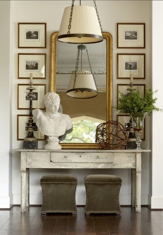 The decor in this image highlights a blend of timeless elegance and rustic, vintage character that perfectly captures the spirit of mountain living. The distressed, primitive-style console table offers a sense of permanence and comfort, while the gilded mirror, classical bust, and formal symmetry of the lighting create a sophisticated, yet inviting, entry point.