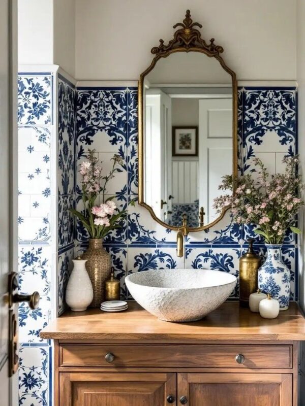 Lighting and Mirrors: An ornate brass-framed mirror hung above a live-edge wood vanity can become a central design element. Pair it with classic, brass-accented sconces to provide warm, inviting illumination.