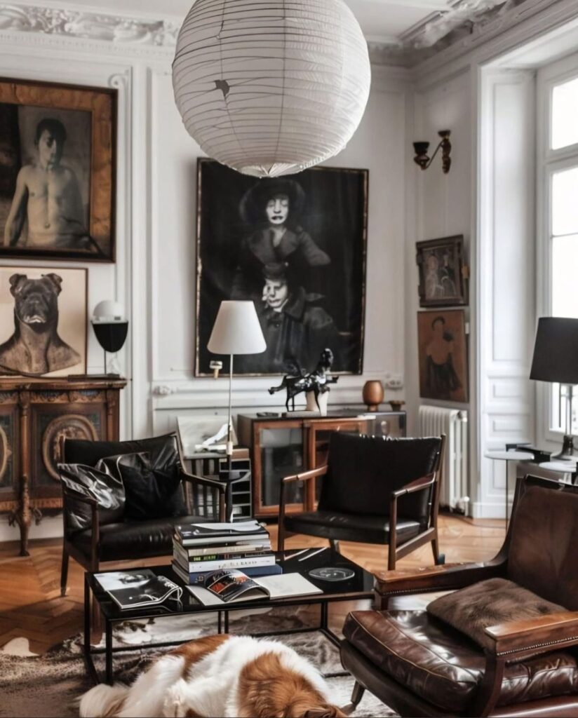 3. **Curated Furnishings:** Instead of opting for a matching set, this space features furniture from various eras, including classic leather armchairs and a modern coffee table. The combination of materials—rich wood, plush leather, and sleek metal—adds depth and visual interest while maintaining an uncluttered feel.