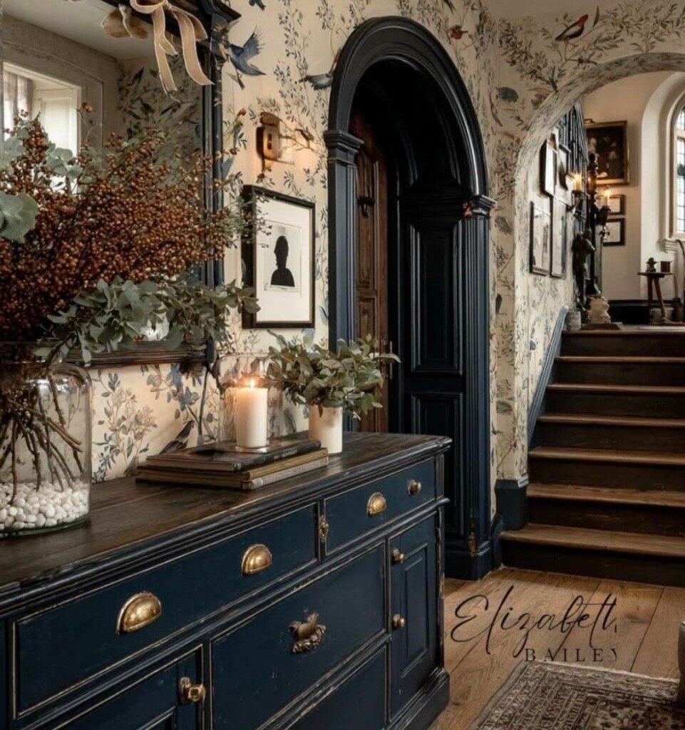 Bold Contrast: The combination of the delicate, nature-inspired wallpaper with the high-gloss, deep navy (or black) trim around the doors and arches creates immediate visual drama.