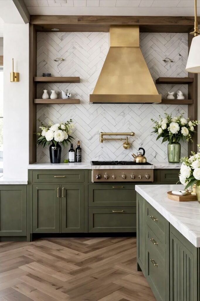 The kitchen is often the gathering place of the home, and its design sets the tone for the entire living space. A popular and enduring trend in interior design is the use of rich, natural colors and metallic accents, as beautifully showcased in this kitchen. The bold olive green cabinetry provides an earthy, sophisticated foundation, while the gleaming brass range hood and pot filler add a touch of timeless luxury and warmth.