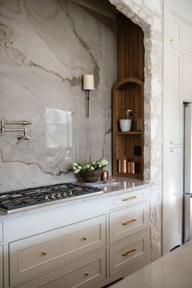 Modern interior design is all about blending high-end finishes with comfortable, natural elements to create spaces that are both luxurious and liveable. As this elegant kitchen corner demonstrates, the combination of a dramatic marble backsplash, warm wooden accents, and sophisticated brass hardware results in a timeless and inviting aesthetic. These thoughtful design choices elevate a functional space into the heart of the home.