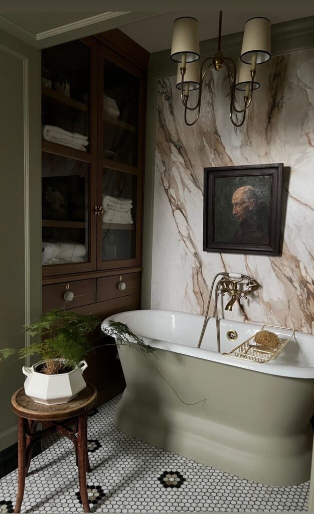 Earthy Palette: The use of muted olive green on the walls and the freestanding tub, paired with a rich, dark wood linen cabinet, brings the natural colors of the Blue Ridge Mountains indoors.