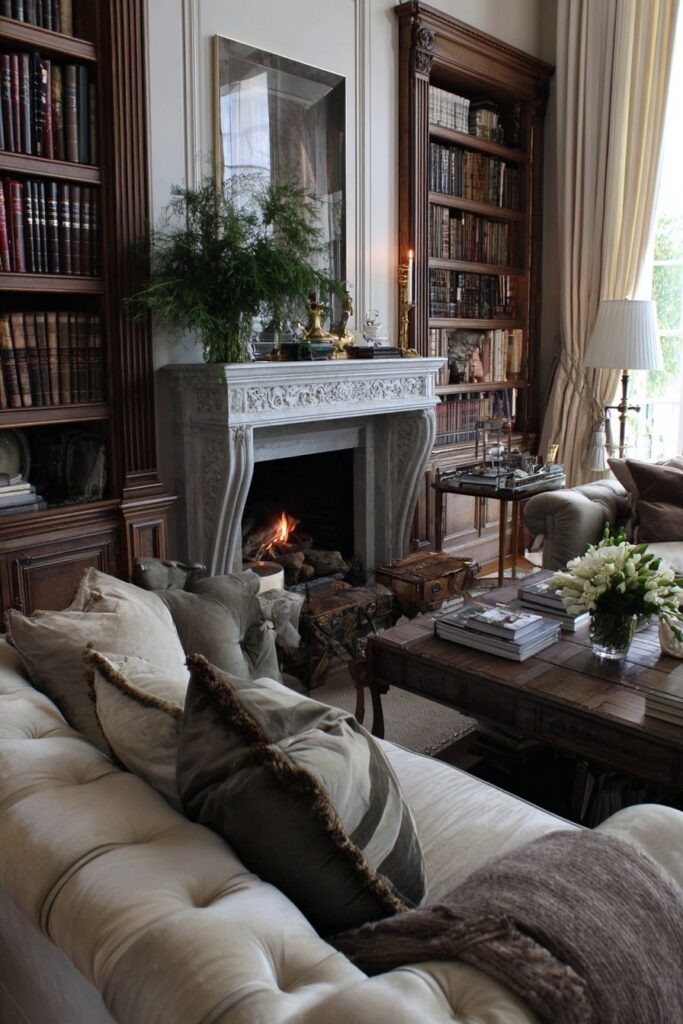 Layered Textures: The design incorporates diverse textures—from the smooth stone of the mantel to the warm, aged wood of the bookshelves and the soft velvet of the pillows—to create a rich and inviting sensory experience.
