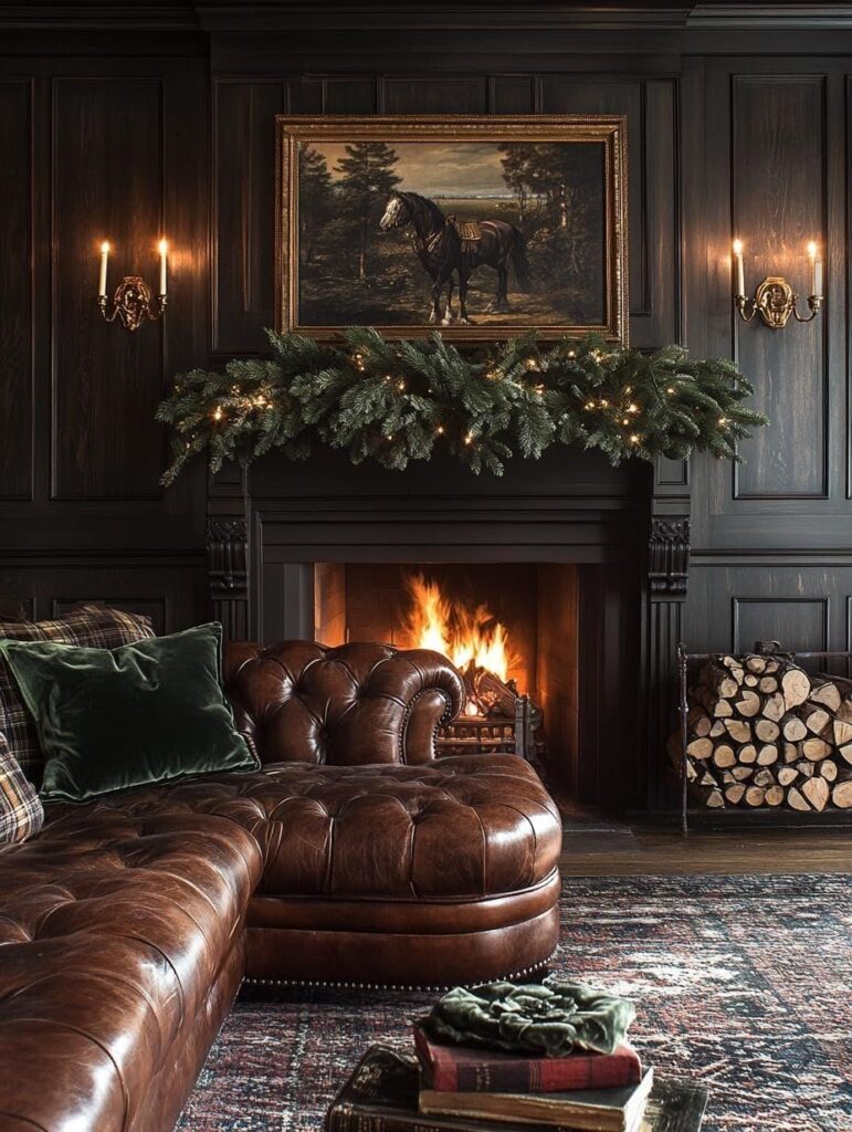 A cozy, classic living room featuring dark wood paneling, a roaring fireplace, and a deep, rich brown leather Chesterfield sectional. The mantel is elegantly draped with a simple, natural-looking Christmas garland and twinkling lights. A traditional painting of a horse in a gold frame hangs above the mantel, and green velvet pillows add a touch of holiday luxury. A rustic log rack next to the fireplace completes the warm, inviting, old-fashioned aesthetic, reminiscent of a Ralph Lauren-inspired design.