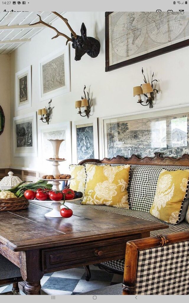 This image beautifully captures the essence of a modern mountain aesthetic. It features a living or dining space that is both rustic and sophisticated, blending timeless elements with a fresh, contemporary feel. The centerpiece is a large, rustic wooden table surrounded by a banquette-style sofa upholstered in striking black-and-white checkered fabric. Bright yellow pillows add a cheerful, modern touch, creating a comfortable and inviting atmosphere for family and friends. The room’s decor—including framed maps and a mounted deer head—reflects a love for history and the outdoor traditions of the area while maintaining an elegant design.
