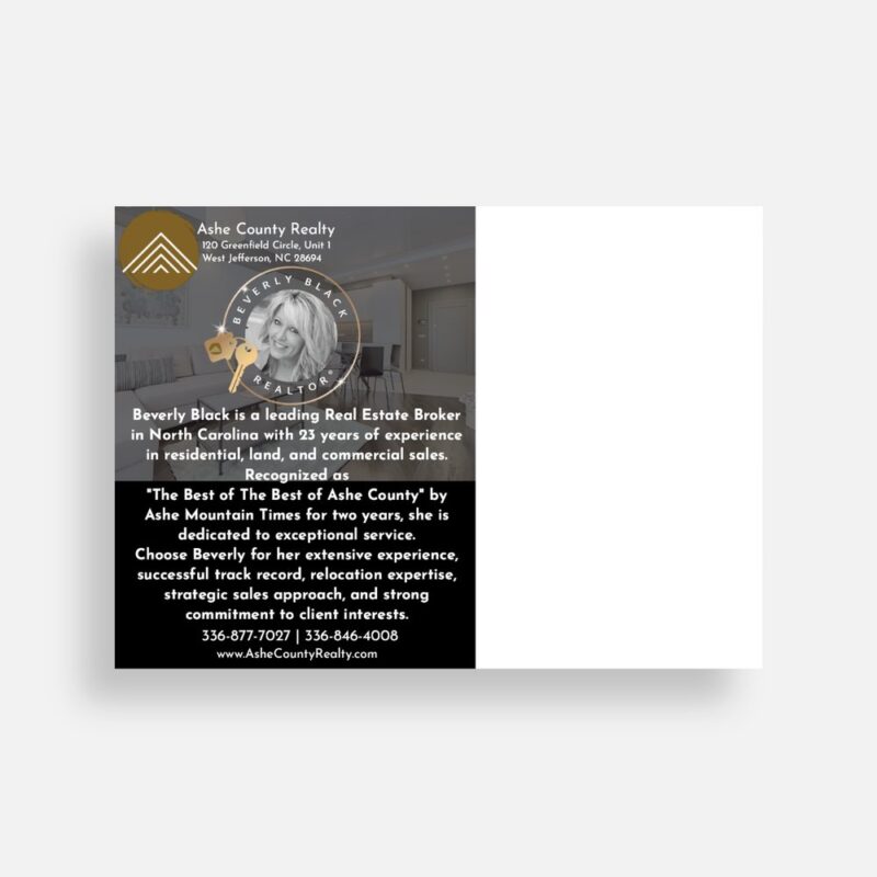 Beverly Black stands out as a premier Real Estate Broker in North Carolina, bringing 23 years of unmatched experience in the industry. Her extensive expertise covers every aspect of real estate, from residential and land sales to commercial transactions. Honored as “The Best of The Best of Ashe County” by Ashe Mountain Times in both 2010 and 2011, Beverly is driven by a passion for providing her clients with exceptional service.